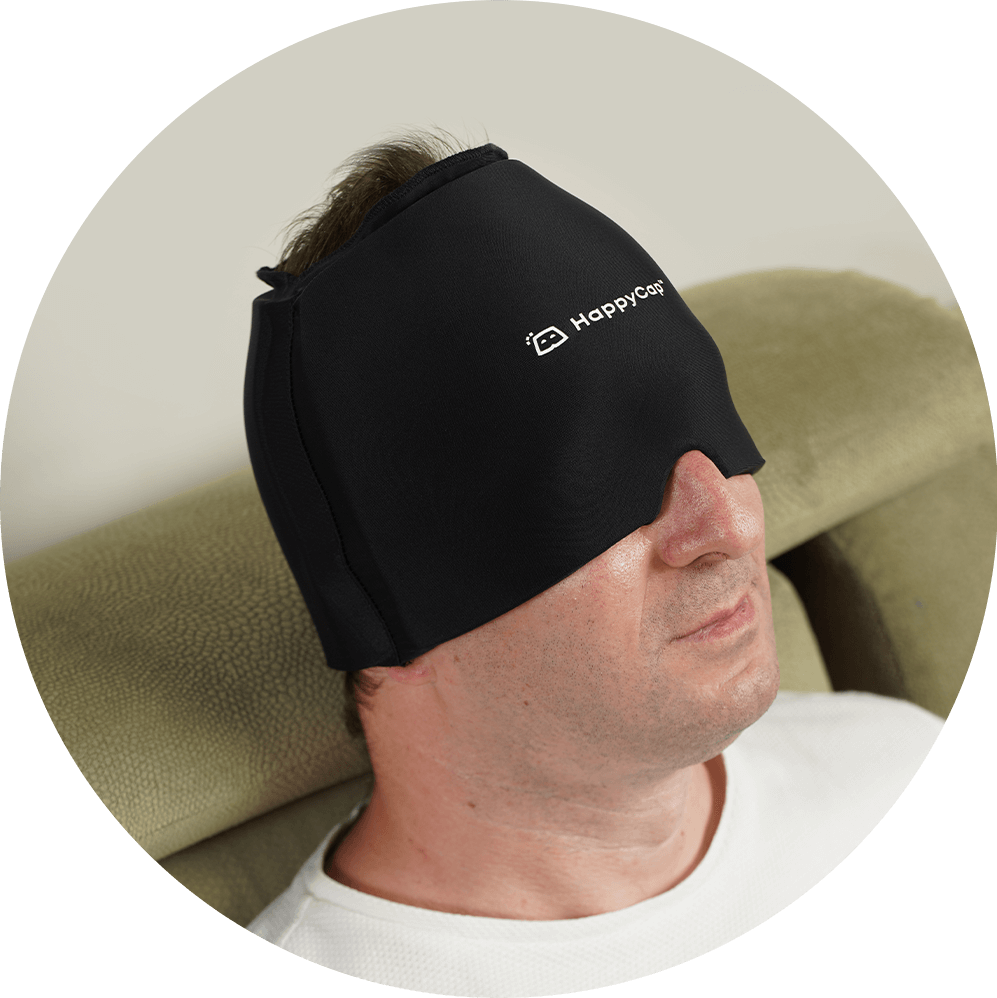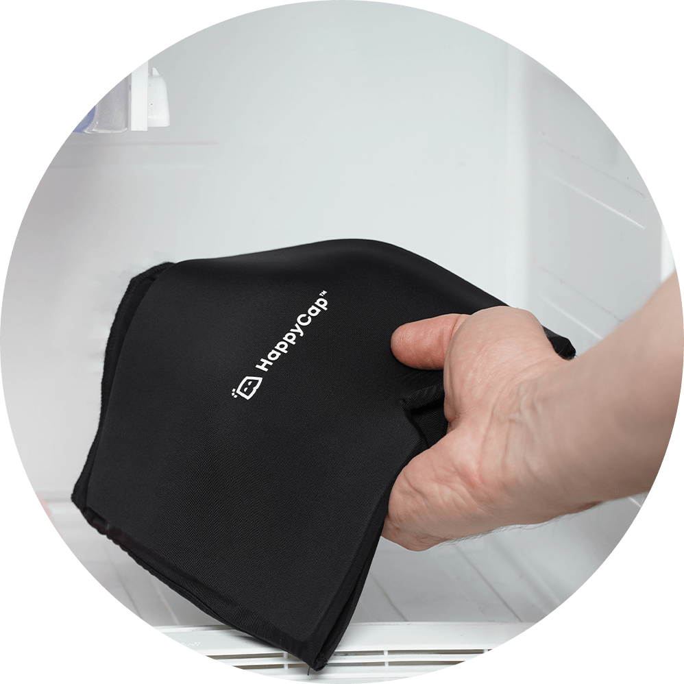 It takes only a few seconds to slide HappyCap on and off. To put it on, simply slide it over your head and enjoy the next few minutes as your discomfort begins to melt away.